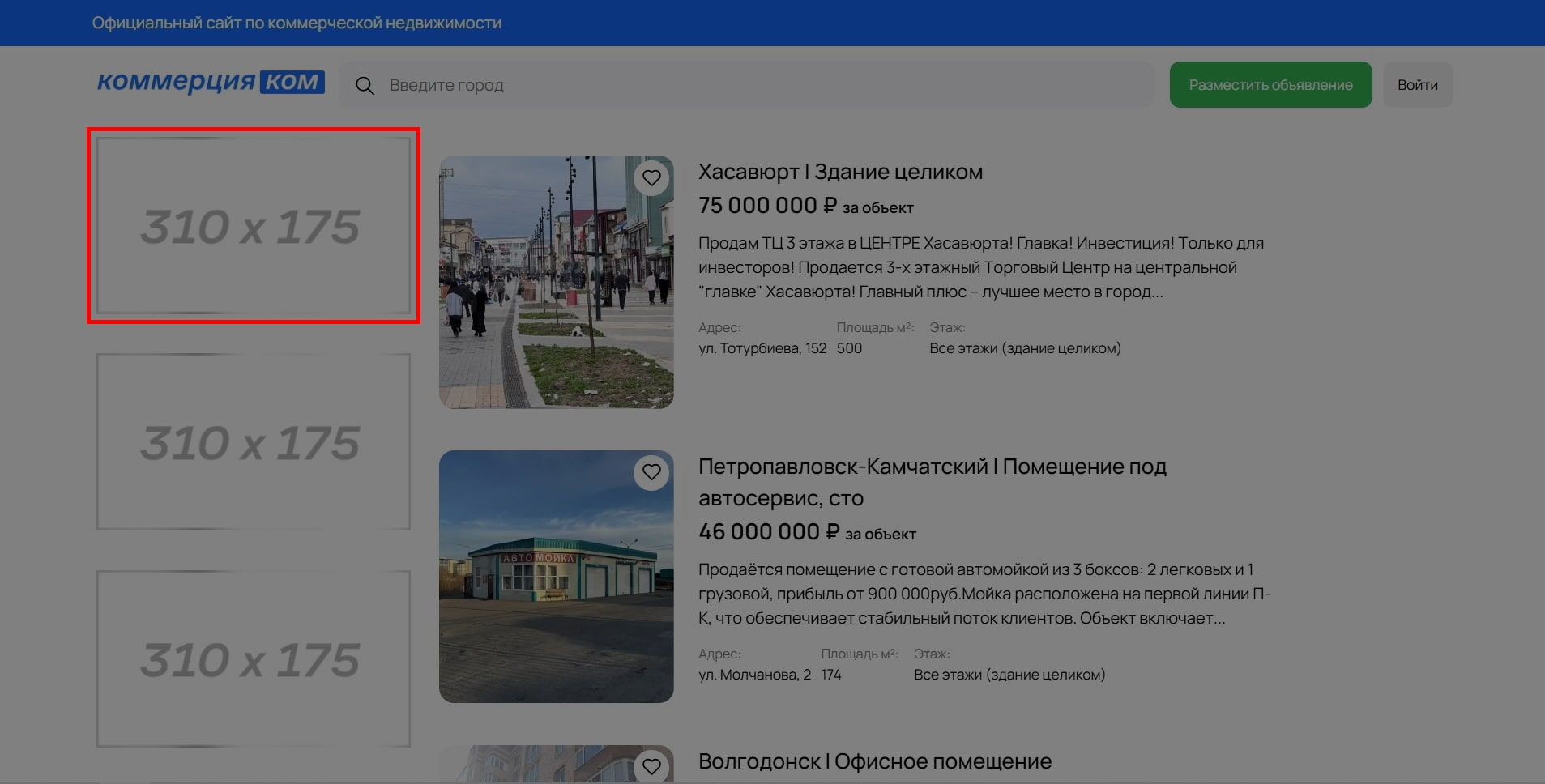 Разместим ваш баннер размером 310 х 175 пикселей в главном каталоге поиска коммерческой недвижимости по всей России, т. е. ваш баннер увидят люди с любого города России.